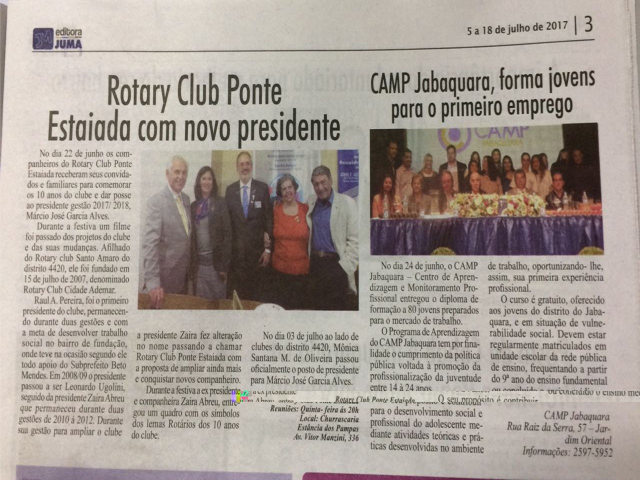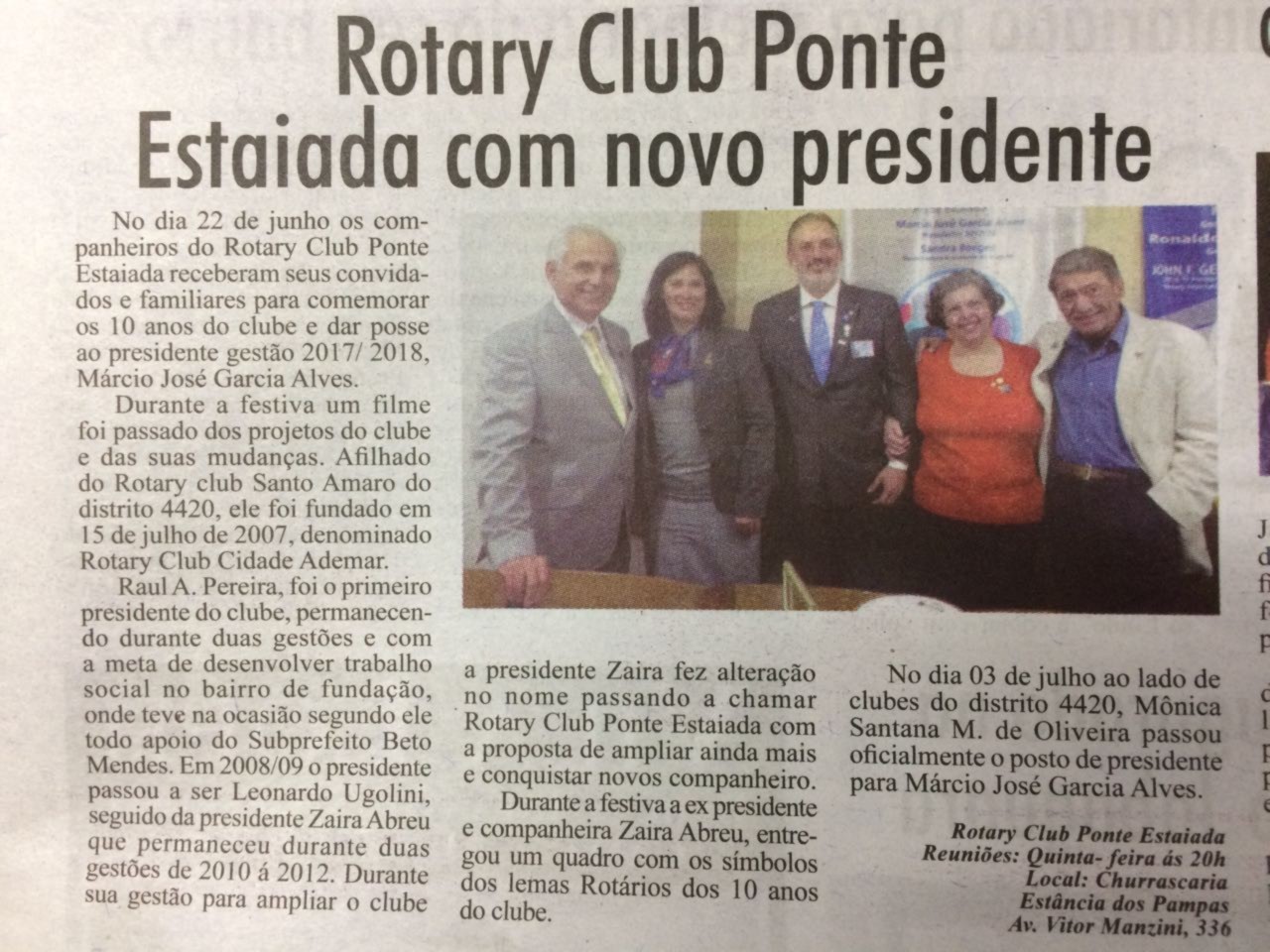 O Jornal Cidade Ademar em Notícias registrou a festiva de Posse do novo presidente do RCSP Ponte Estaiada. Contando um pouquinho da trajetória do clube durante os 10 anos, citou o presidente Fundador Raul Pereira, os presidentes Leonardo Ugolini e Zaira Abreu, que entregou um quadro de presente para o clube com o lema de cada um dos 10 anos rotários que o clube vivenciou e a transmissão da presidente Humanitária Mônica Oliveira para o atual presidente Que Faz a Diferença, Márcio Garcia.