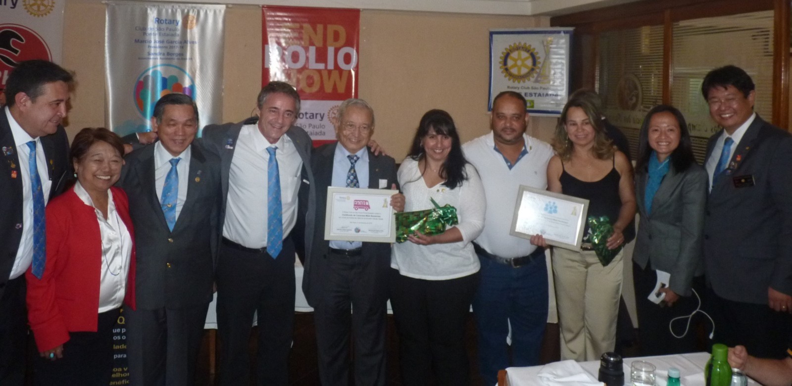 Marcio José Garcia Alves e Raul Pereira receberam sua 2º Safira, correspondente a doações acumuladas de mais de US$ 3.000,00 à Fundação Rotária. Já o companheiro Pedro Baptista Oviedo recebeu o seu 1º Rubi, correspondente a doações acumuladas de mais de US$ 7.000,00 à Fundação.