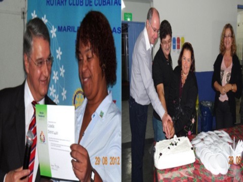 Na última reunião do mês de agosto (29/08), tivemos a tradicional comemoração dos Aniversários dos Companheiros do Mês. Nesta noite também recebemos o governador agregador 2011-2012, Fernando Dias Sobrinho e sua esposa Sonia que vieram entregar oficialmente a Menção Presidencial do Distrito4420 conferida ao Rotary Club de Cubatão pela excelência em desenvolvimento do quadro associativo e contribuição à Fundação Rotária. A menção foi entregue pelo governador à presidente agregadora 2011-2012, Camila Batista Sotero que também nesta noite teve uma grata surpresa ao tomar conhecimento de sua indicação pelo Distrito 4420 ao cargo de Governadora Assistente para o Ano Rotário 2013-2014.